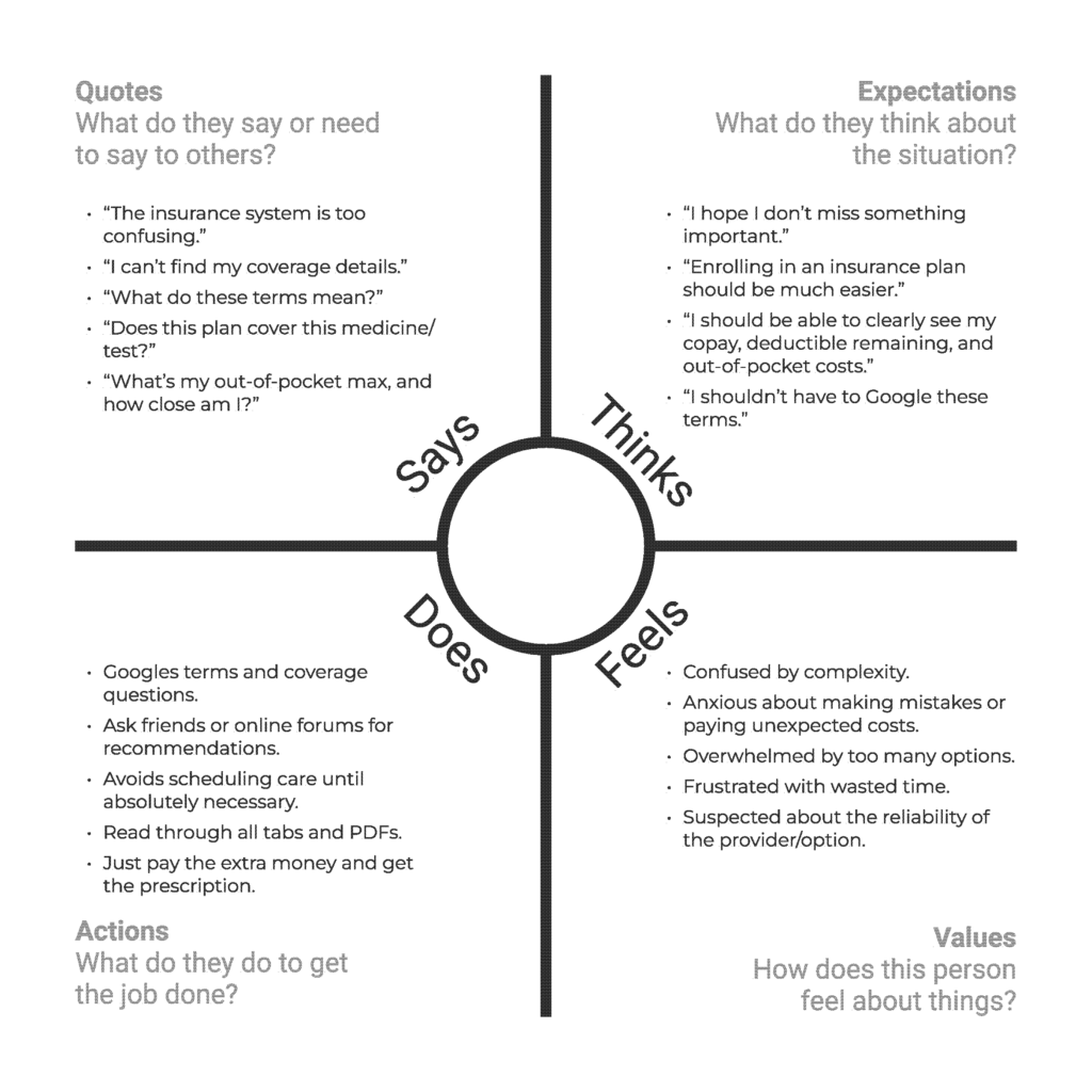 These behaviors reflect a broader desire for clearer explanations, simpler comparisons, and more trustworthy guidance. The empathy map helps us understand these needs and informs how BeInsured can better support students throughout their insurance-selection process.