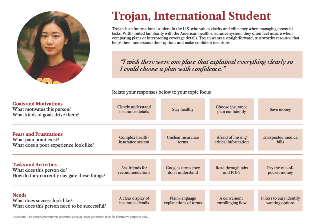This persona represents a core segment of our intended users and has been central to shaping the direction of BeInsured. Understanding Trojan’s goals, frustrations, and decision-making habits has helped us identify the specific problems international students face and guided the design of features that simplify comparison, clarify coverage, and support more confident insurance choices.