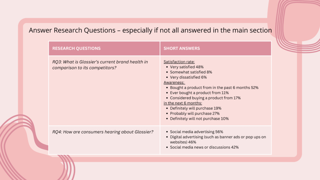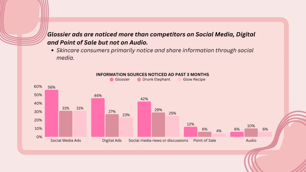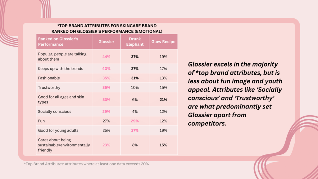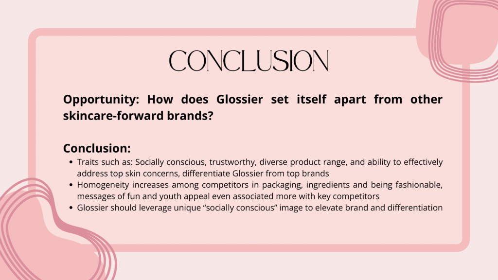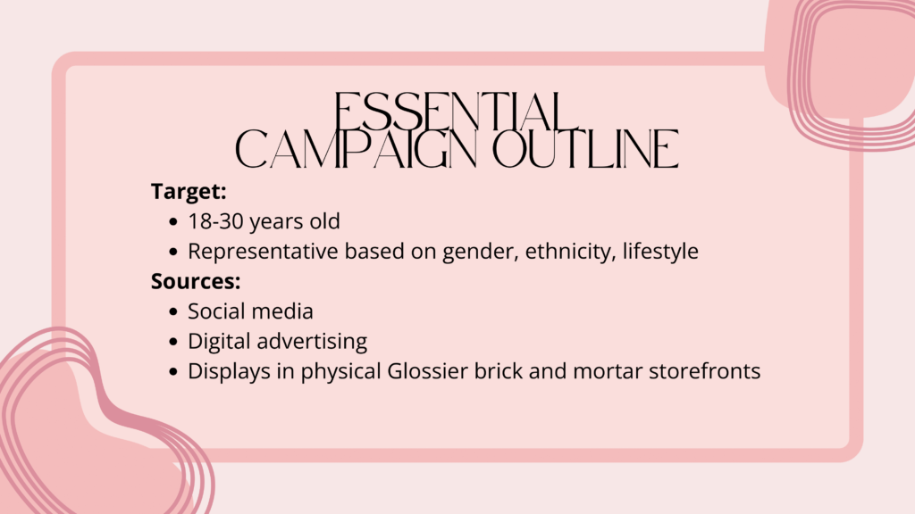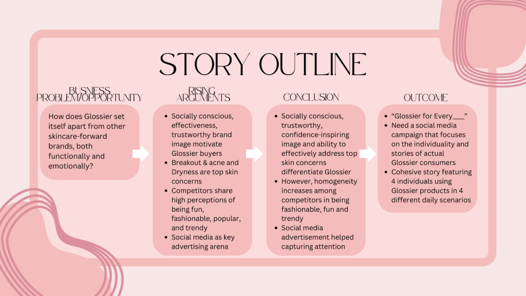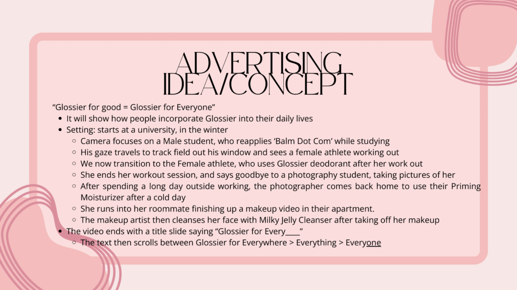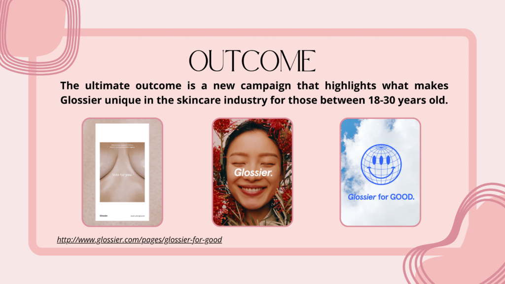 After digging through the data, we found four strong points that stood out. From there, we concluded that Glossier can boost its brand by leaning into its unique “socially conscious” image. We pitched an ad campaign for 18-30-year-olds to show how Glossier fits into their everyday lives, blending personal style with social awareness.