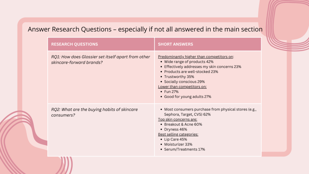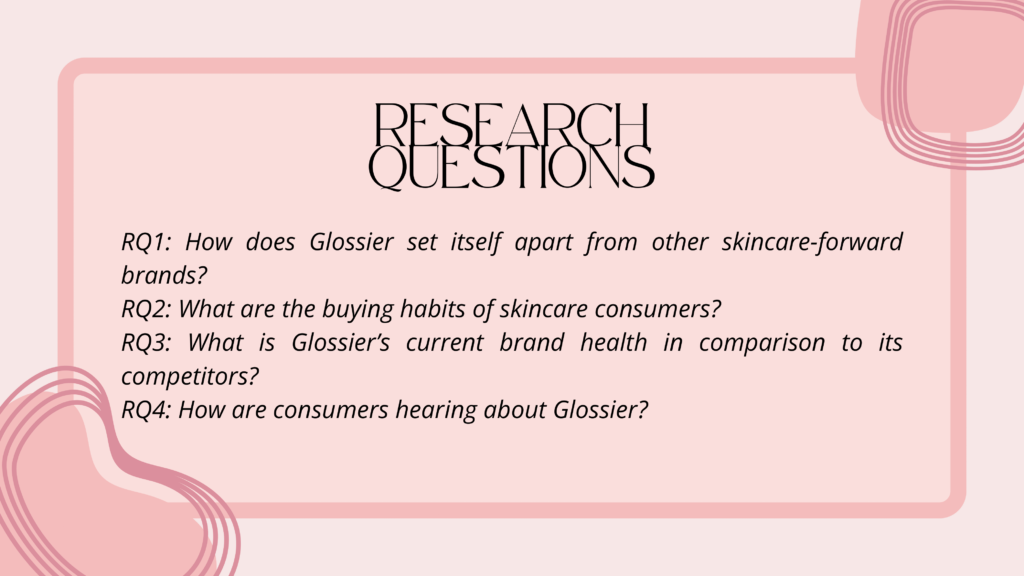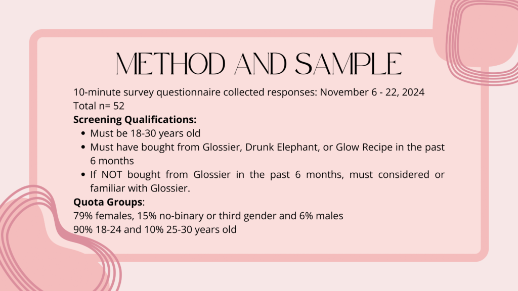 To uncover how young consumers perceive Glossier, I designed a questionnaire targeting individuals aged 18-30 who invest in skincare. The survey explored Glossier’s brand differentiation, consumer expectations, and purchasing barriers.