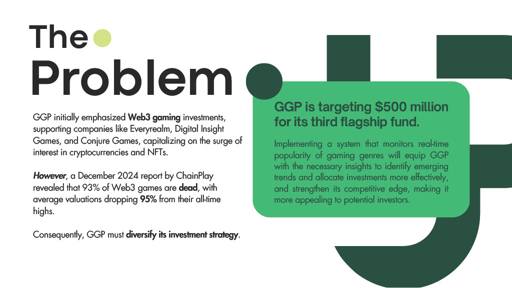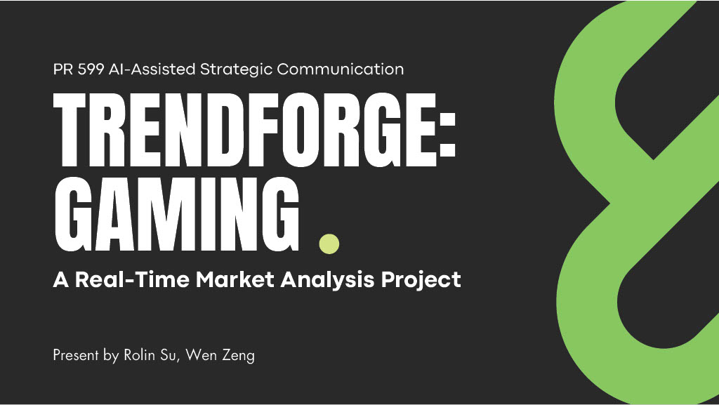 Griffin Gaming Partners (GGP), one of the world’s leading venture funds focused exclusively on gaming, rose with its Web3 investments. But by the end of 2024, Web3 gaming saw sharp declines. To help GGP stay ahead in an increasingly competitive market, my partner and I developed a real-time market analysis project called TRENDFORGE: GAMING as part of PR 599: AI-Assisted Strategic Communication.