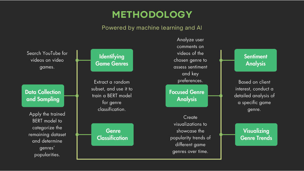 Using a BERT-based classification model trained on video content and user data from platforms like YouTube, the system identifies trending genres, analyzes player sentiment through comments, and surfaces key preferences and emerging patterns.