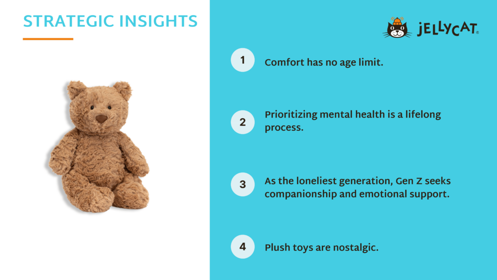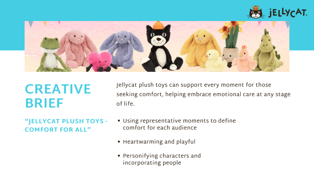 Comfort for All is our answer—a campaign that invites people to embrace softness without shame. With messaging that normalizes adult comfort culture and sparks joy across generations, the goal is simple: to help Jellycat break the stigma and become a symbol of comfort for all, everywhere.
