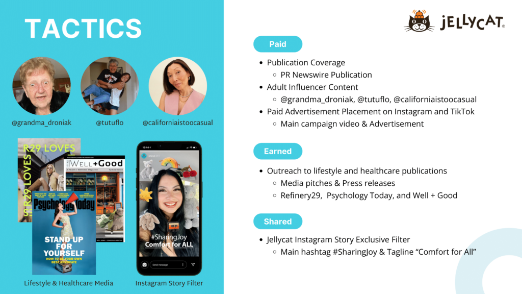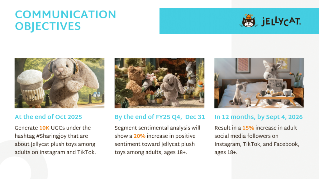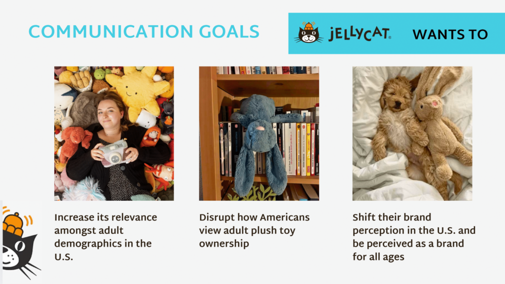 As part of PR 508: Foundations of Public Relations and Advertising, my team and I developed a campaign for Jellycat, the British brand known for its irresistibly soft plush toys. The project—Comfort for All—tackles the stigma around adults owning plushies by positioning Jellycat as a source of emotional support for any age. It features a full campaign concept, including brand analysis, crafted messaging, and an integrated PESO media strategy.